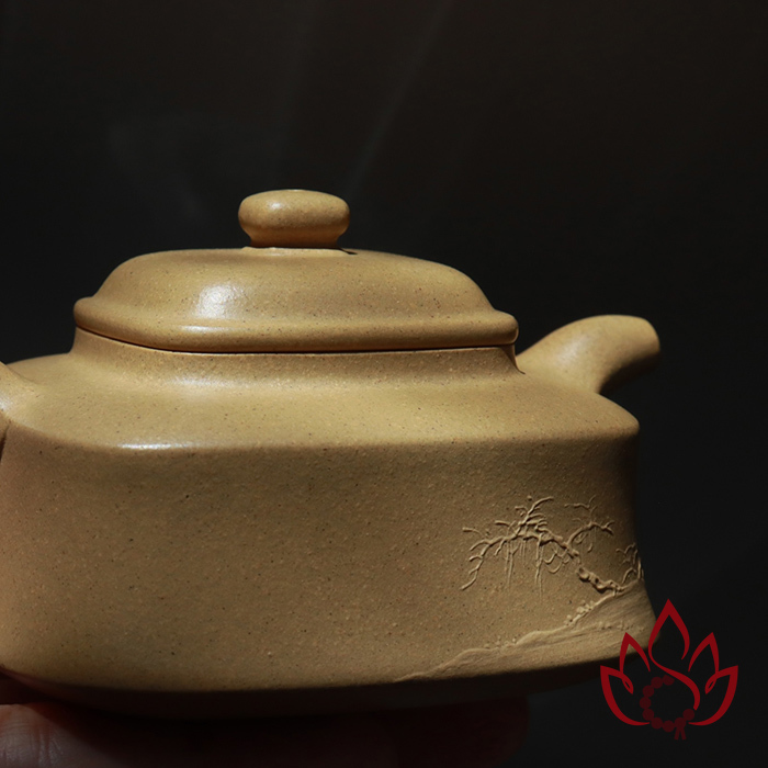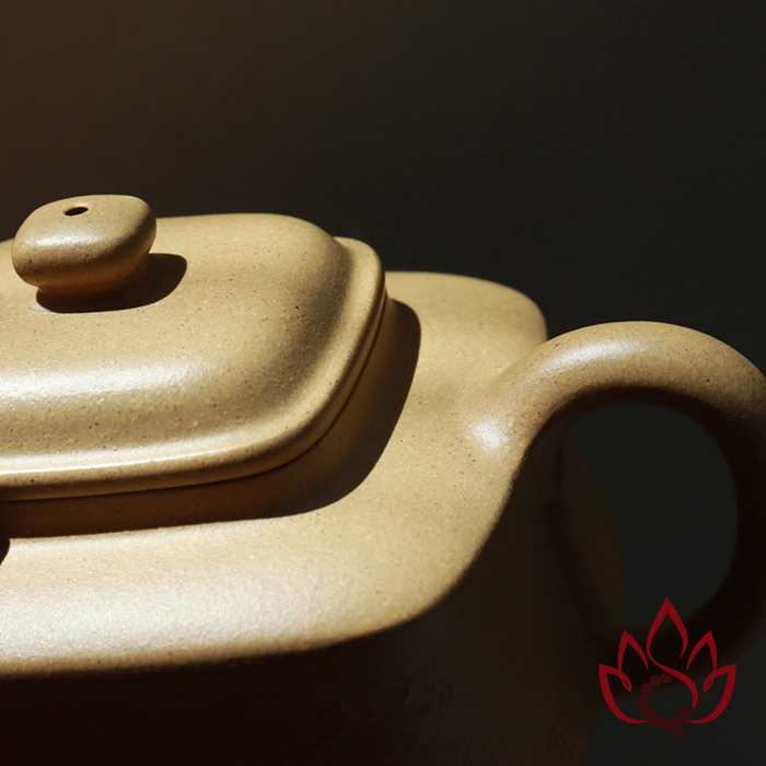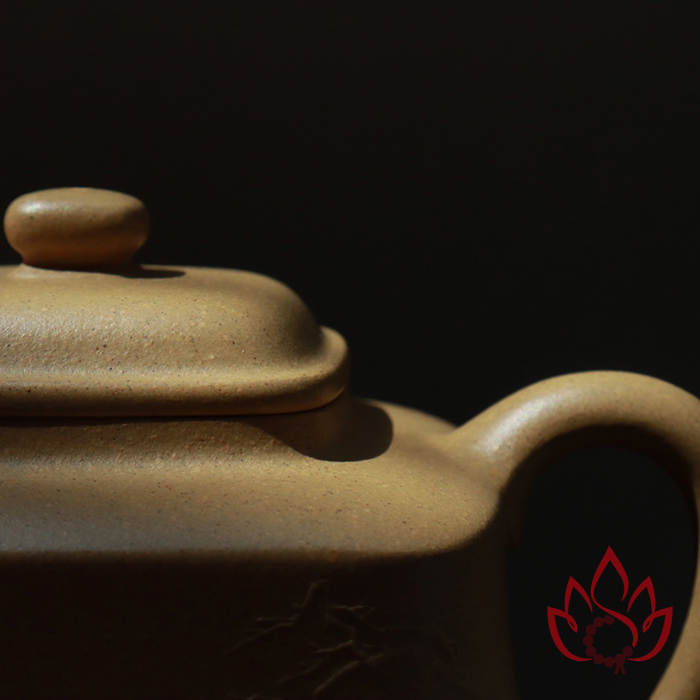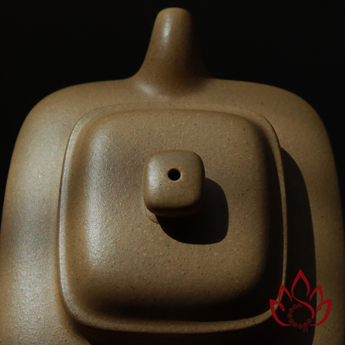 Thân ấm mang bố cục phẳng - vuông - tròn được bố trí hài hòa, tạo cảm giác trang nghiêm, mạnh mẽ nhưng vẫn giữ nét mềm mại.