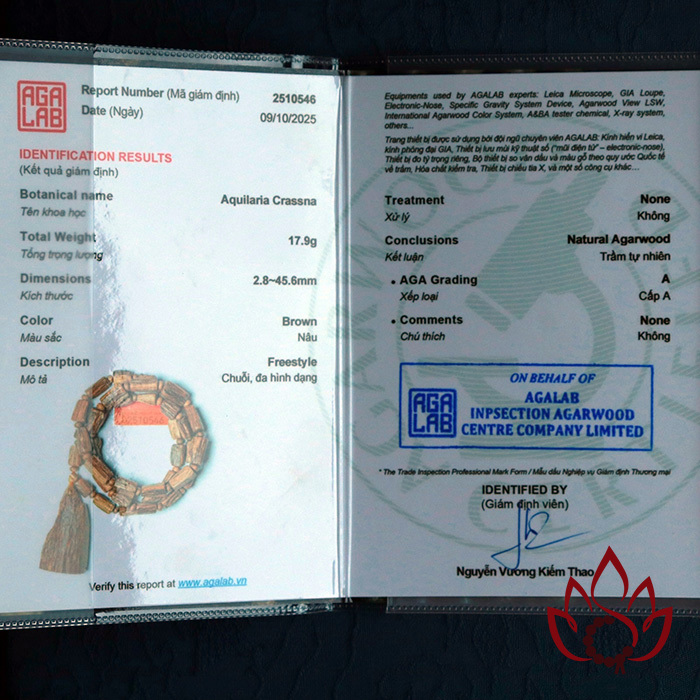 Mỗi sản phẩm đều đi kèm mã kiểm định riêng biệt được cấp bởi Trung tâm giám định trầm hương AGALAB – tổ chức uy tín trong ngành, tiêu chuẩn ISO quốc tế. Khách hàng hoàn toàn an tâm về nguồn gốc trầm tự nhiên, không ép dầu, không hóa chất, đúng như cam kết từ Trầm Hương Phúc Thảo.