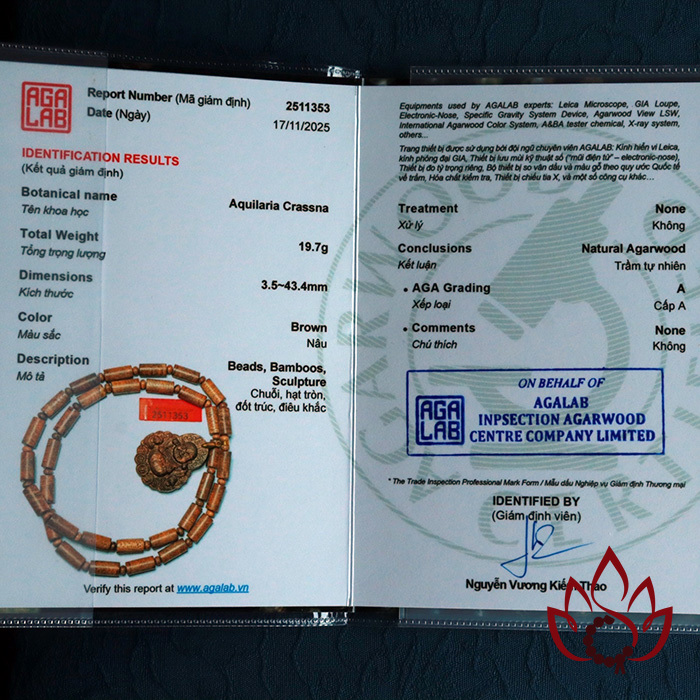 Hình ảnh sản phẩm được minh họa bằng mã kiểm định AGALAB cụ thể (như 2511353), tuy nhiên mỗi vòng trầm khi giao đến tay khách sẽ đi kèm mã kiểm định riêng, tương ứng với từng sản phẩm ở thời điểm bán ra. Tất cả đều được giám định bởi AGALAB – cam kết là trầm hương tự nhiên 100%, không ép dầu, không sánh ép – không hoá chất - nói không với hàng công nghệ.