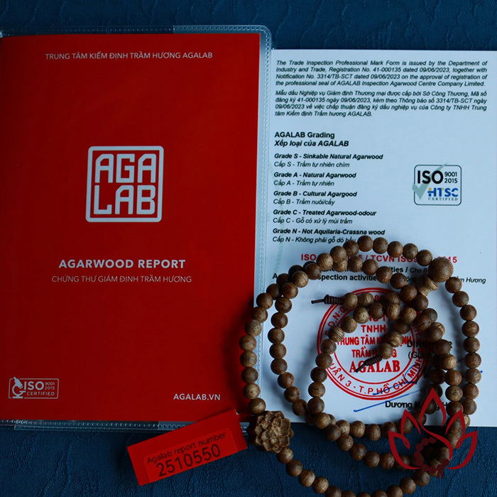 Hình ảnh sản phẩm được minh họa bằng mã kiểm định AGALAB cụ thể (như 2510550), tuy nhiên mỗi vòng trầm khi giao đến tay khách sẽ đi kèm mã kiểm định riêng, tương ứng với từng sản phẩm ở thời điểm bán ra. Tất cả đều được giám định bởi AGALAB – cam kết là trầm hương tự nhiên 100%, không ép dầu, không sánh ép – không hoá chất - nói không với hàng công nghệ.