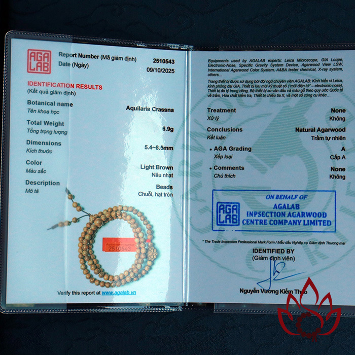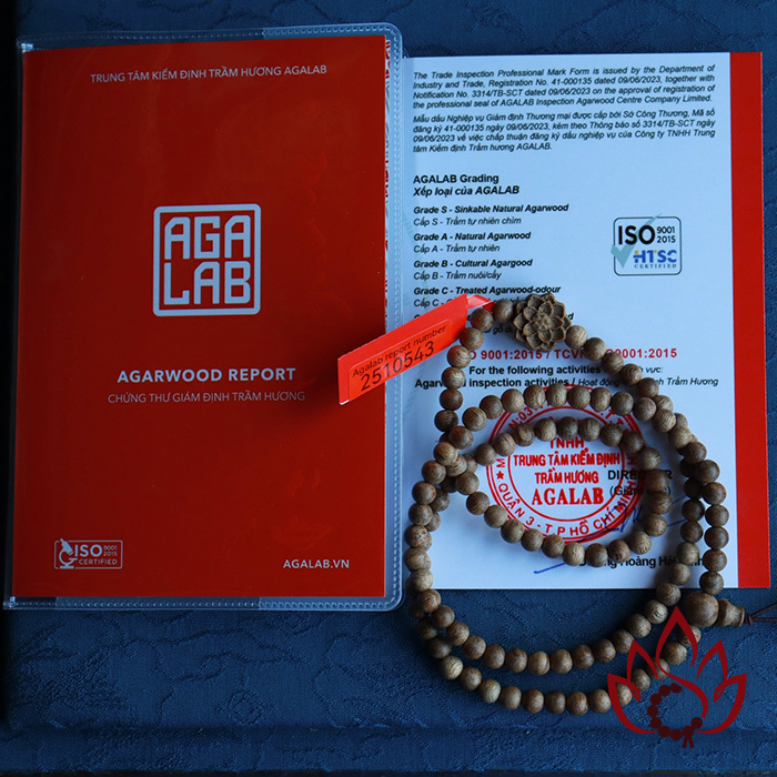 Hình ảnh sản phẩm được minh họa bằng mã kiểm định AGALAB cụ thể (như 2510543), tuy nhiên mỗi vòng trầm khi giao đến tay khách sẽ đi kèm mã kiểm định riêng, tương ứng với từng sản phẩm ở thời điểm bán ra. Tất cả đều được giám định bởi AGALAB – cam kết là trầm hương tự nhiên 100%, không ép dầu, không sánh ép – không hoá chất - nói không với hàng công nghệ.