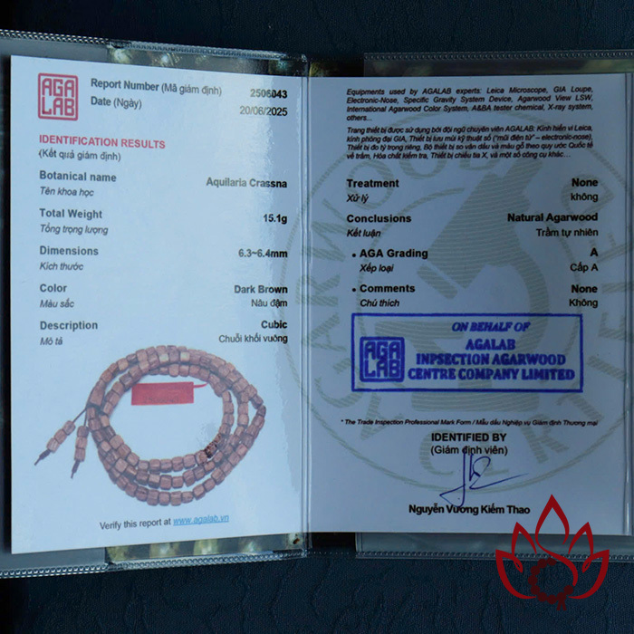 Mỗi vòng tay đều đi kèm mã kiểm định riêng biệt được cấp bởi Trung tâm giám định trầm hương AGALAB – tổ chức uy tín trong ngành, tiêu chuẩn ISO quốc tế.
