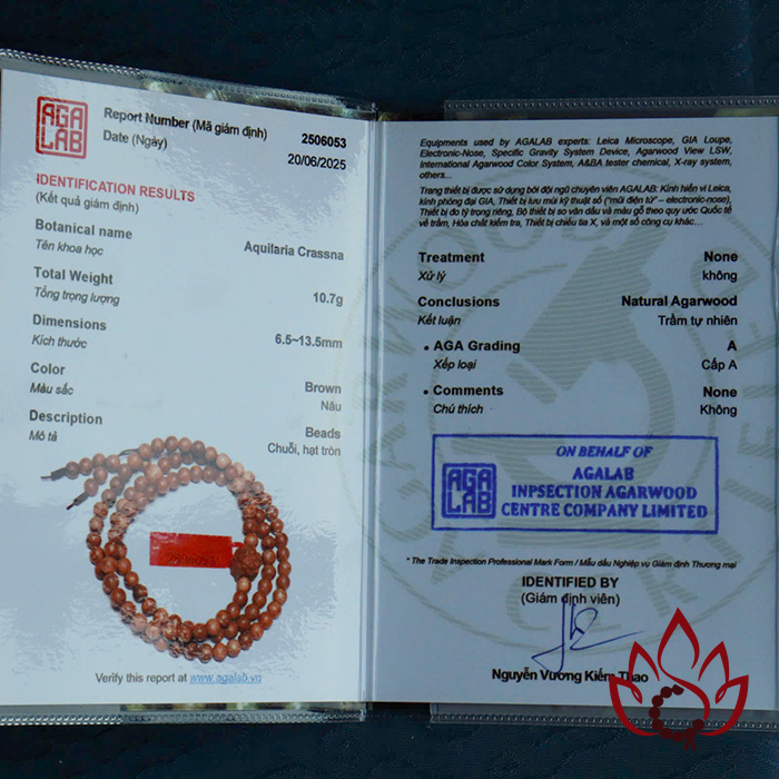 Mỗi vòng tay đều đi kèm mã kiểm định riêng biệt được cấp bởi Trung tâm giám định trầm hương AGALAB – tổ chức uy tín trong ngành, tiêu chuẩn ISO quốc tế.