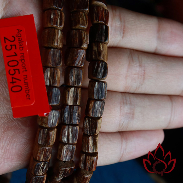 Hình ảnh sản phẩm được minh họa bằng mã kiểm định AGALAB cụ thể (như 2510540), tuy nhiên mỗi vòng trầm khi giao đến tay khách sẽ đi kèm mã kiểm định riêng, tương ứng với từng sản phẩm ở thời điểm bán ra.
