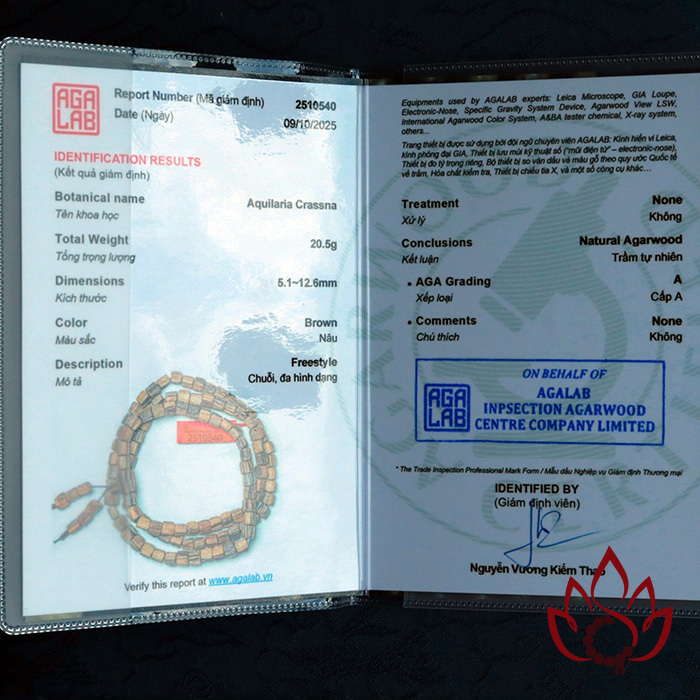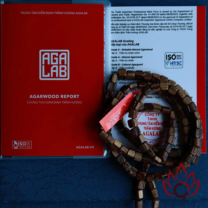 Mỗi vòng tay đều đi kèm mã kiểm định riêng biệt được cấp bởi Trung tâm giám định trầm hương AGALAB – tổ chức uy tín trong ngành, tiêu chuẩn ISO quốc tế.