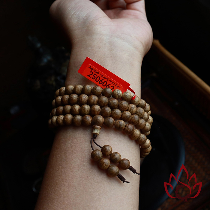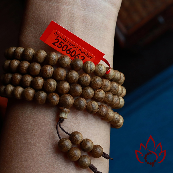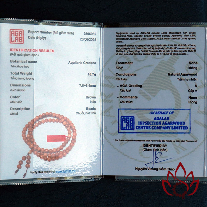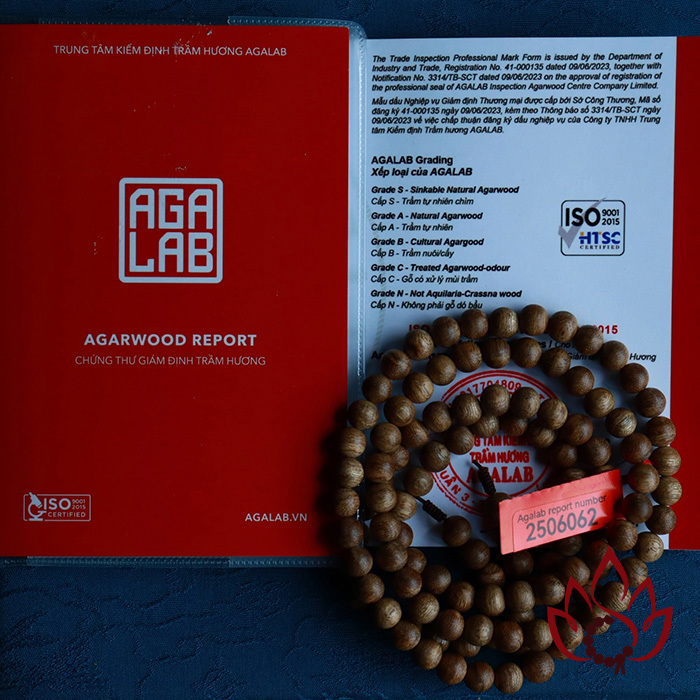 Mỗi vòng tay đều đi kèm mã kiểm định riêng biệt được cấp bởi Trung tâm giám định trầm hương AGALAB – tổ chức uy tín trong ngành, tiêu chuẩn ISO quốc tế.