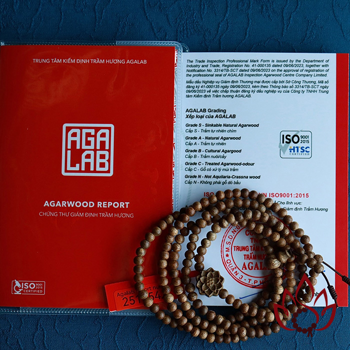 Mỗi vòng tay đều đi kèm mã kiểm định riêng biệt được cấp bởi Trung tâm giám định trầm hương AGALAB – tổ chức uy tín trong ngành, tiêu chuẩn ISO quốc tế. Khách hàng hoàn toàn an tâm về nguồn gốc trầm tự nhiên, không ép dầu, không hóa chất, đúng như cam kết từ Trầm Hương Phúc Thảo.