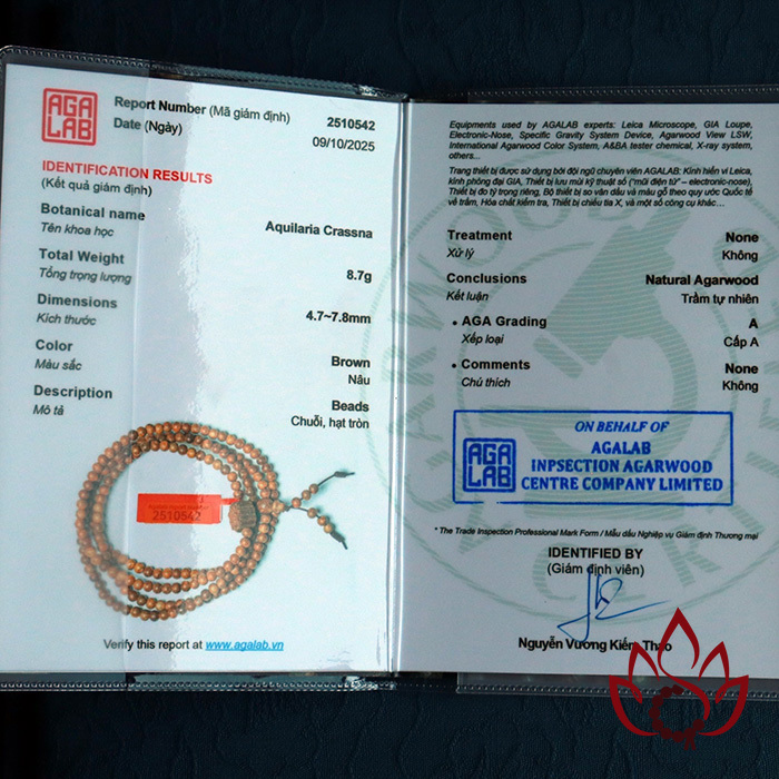 Hình ảnh sản phẩm được minh họa bằng mã kiểm định AGALAB cụ thể (như 2510542), tuy nhiên mỗi vòng trầm khi giao đến tay khách sẽ đi kèm mã kiểm định riêng, tương ứng với từng sản phẩm ở thời điểm bán ra. Tất cả đều được giám định bởi AGALAB – cam kết là trầm hương tự nhiên 100%, không ép dầu, không sánh ép – không hoá chất - nói không với hàng công nghệ.
