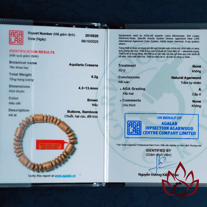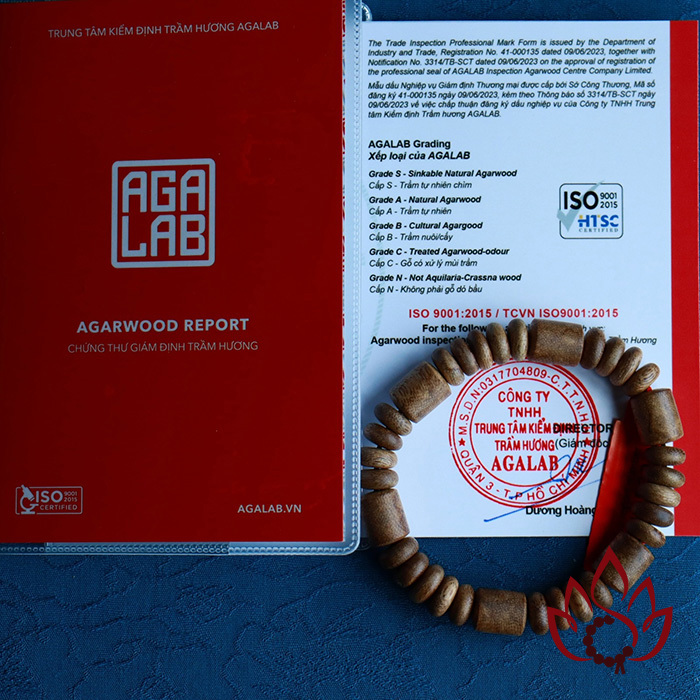 Mỗi vòng tay đều đi kèm mã kiểm định riêng biệt được cấp bởi Trung tâm giám định trầm hương AGALAB – tổ chức uy tín trong ngành, tiêu chuẩn ISO quốc tế.