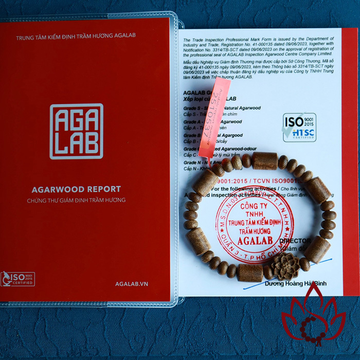 Mỗi vòng tay đều đi kèm mã kiểm định riêng biệt được cấp bởi Trung tâm giám định trầm hương AGALAB – tổ chức uy tín trong ngành, tiêu chuẩn ISO quốc tế.