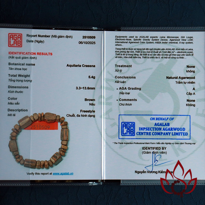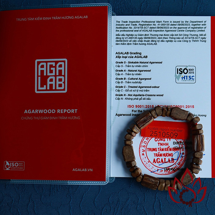 Hình ảnh sản phẩm được minh họa bằng mã kiểm định AGALAB cụ thể (như 2510509), tuy nhiên mỗi vòng trầm khi giao đến tay khách sẽ đi kèm mã kiểm định riêng, tương ứng với từng sản phẩm ở thời điểm bán ra. Tất cả đều được giám định bởi AGALAB – cam kết là trầm hương tự nhiên 100%, không ép dầu, không sánh ép – không hoá chất - nói không với hàng công nghệ.