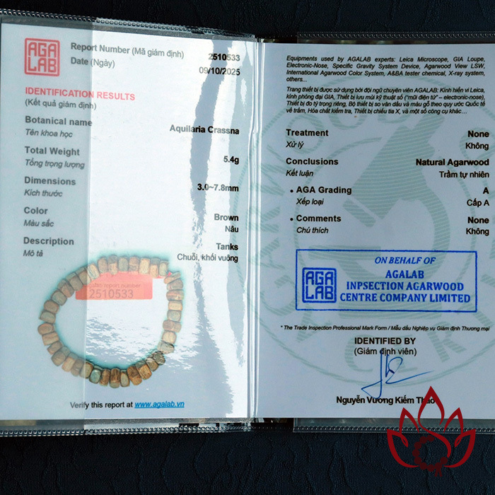 Mỗi vòng tay đều đi kèm mã kiểm định riêng biệt được cấp bởi Trung tâm giám định trầm hương AGALAB – tổ chức uy tín trong ngành, tiêu chuẩn ISO quốc tế. Khách hàng hoàn toàn an tâm về nguồn gốc trầm tự nhiên, không ép dầu, không hóa chất, đúng như cam kết từ Trầm Hương Phúc Thảo.
