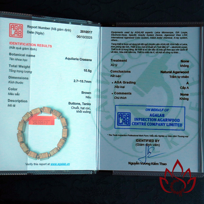 Hình ảnh sản phẩm được minh họa bằng mã kiểm định AGALAB cụ thể (như 2510517), tuy nhiên mỗi vòng trầm khi giao đến tay khách sẽ đi kèm mã kiểm định riêng, tương ứng với từng sản phẩm ở thời điểm bán ra. Tất cả đều được giám định bởi AGALAB – cam kết là trầm hương tự nhiên 100%, không ép dầu, không sánh ép – không hoá chất - nói không với hàng công nghệ.