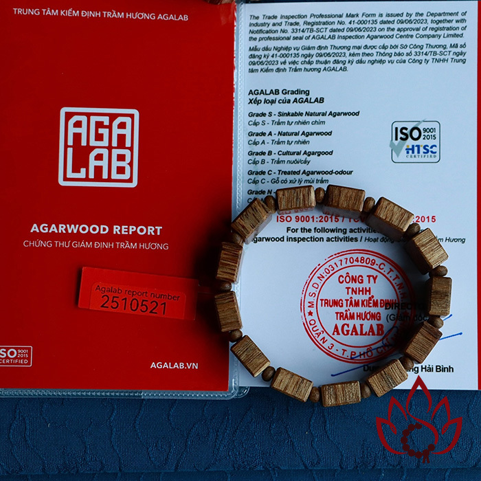 Mỗi vòng tay đều đi kèm mã kiểm định riêng biệt được cấp bởi Trung tâm giám định trầm hương AGALAB – tổ chức uy tín trong ngành, tiêu chuẩn ISO quốc tế.