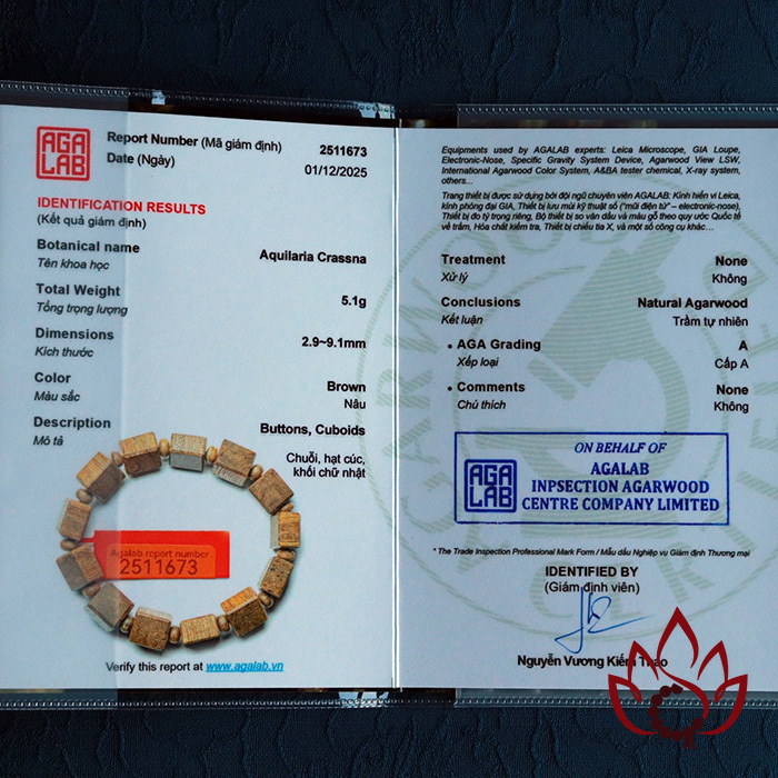 Hình ảnh sản phẩm được minh họa bằng mã kiểm định AGALAB cụ thể (như 2511673), tuy nhiên mỗi vòng trầm khi giao đến tay khách sẽ đi kèm mã kiểm định riêng, tương ứng với từng sản phẩm ở thời điểm bán ra. Tất cả đều được giám định bởi AGALAB - cam kết là trầm hương tự nhiên 100%, không ép dầu, không sánh ép - không hoá chất - nói không với hàng công nghệ.