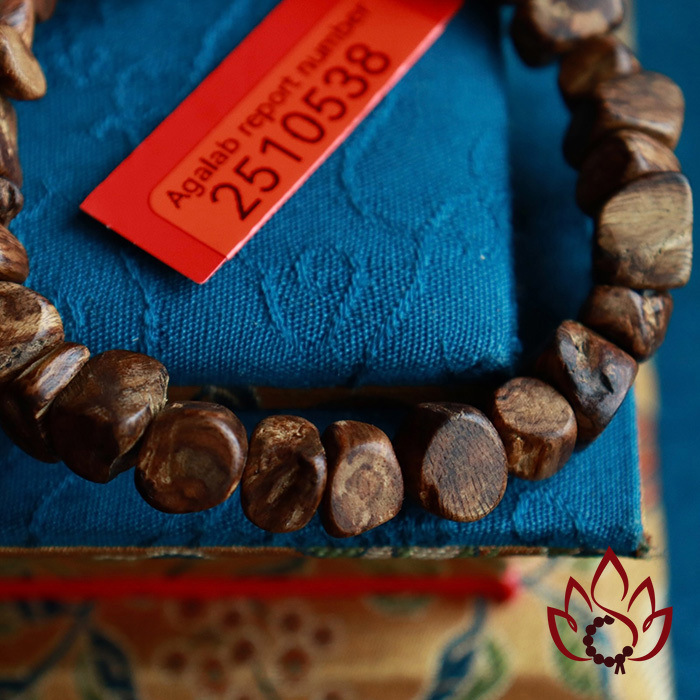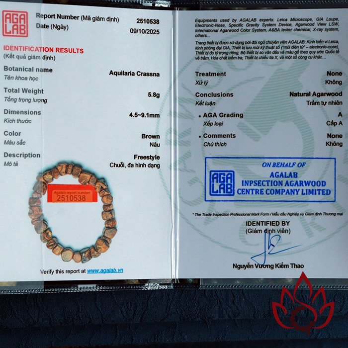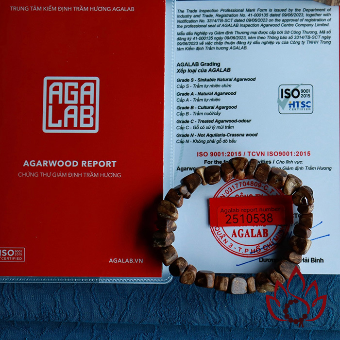 Mỗi vòng tay đều đi kèm mã kiểm định riêng biệt được cấp bởi Trung tâm giám định trầm hương AGALAB – tổ chức uy tín trong ngành, tiêu chuẩn ISO quốc tế.