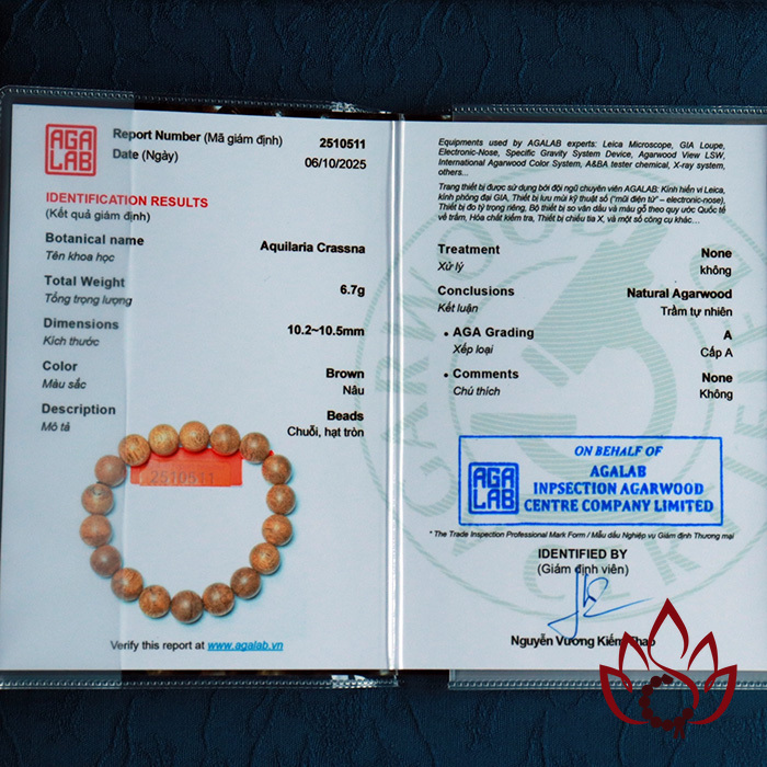 Hình ảnh sản phẩm được minh họa bằng mã kiểm định AGALAB cụ thể (như 2510511), tuy nhiên mỗi vòng trầm khi giao đến tay khách sẽ đi kèm mã kiểm định riêng, tương ứng với từng sản phẩm ở thời điểm bán ra. Tất cả đều được giám định bởi AGALAB – cam kết là trầm hương tự nhiên 100%, không ép dầu, không sánh ép – không hoá chất - nói không với hàng công nghệ.
