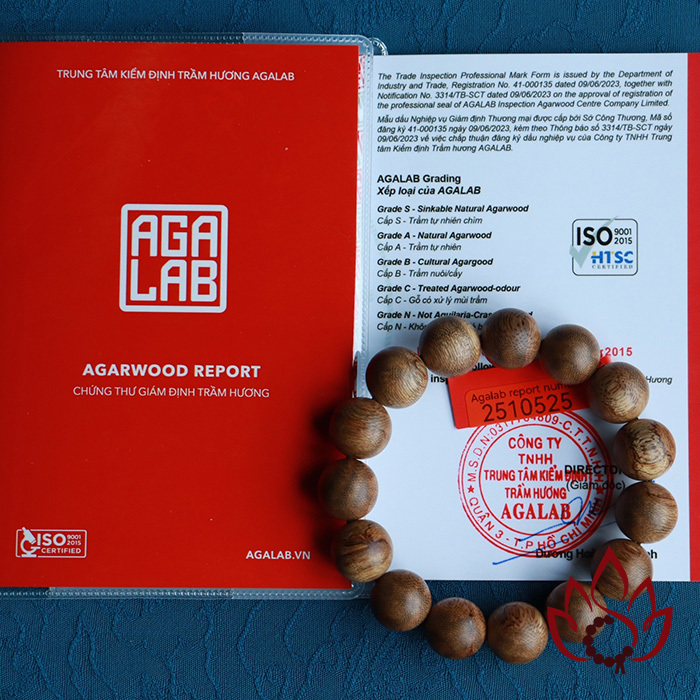 Mỗi vòng tay đều đi kèm mã kiểm định riêng biệt được cấp bởi Trung tâm giám định trầm hương AGALAB – tổ chức uy tín trong ngành, tiêu chuẩn ISO quốc tế.