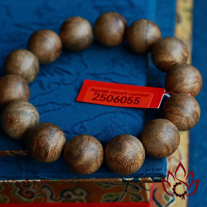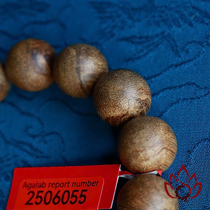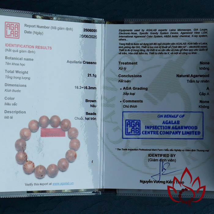 Mỗi vòng tay đều đi kèm mã kiểm định riêng biệt được cấp bởi Trung tâm giám định trầm hương AGALAB – tổ chức uy tín trong ngành, tiêu chuẩn ISO quốc tế.