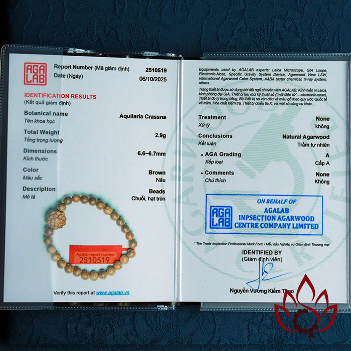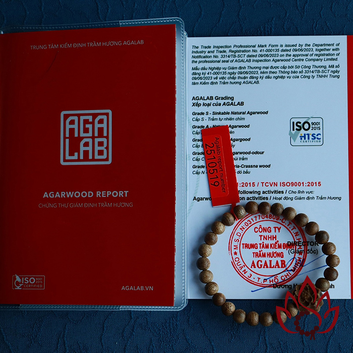 Mỗi vòng tay đều đi kèm mã kiểm định riêng biệt được cấp bởi Trung tâm giám định trầm hương AGALAB – tổ chức uy tín trong ngành, tiêu chuẩn ISO quốc tế.