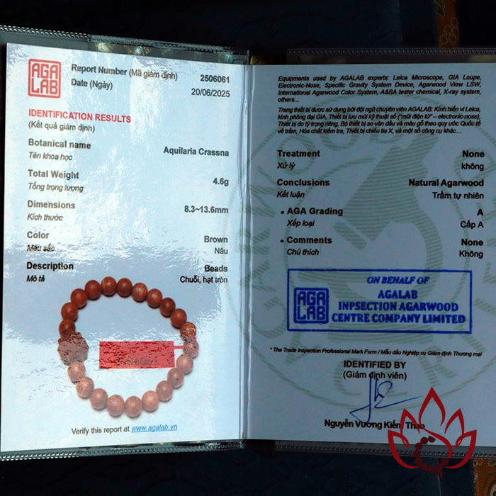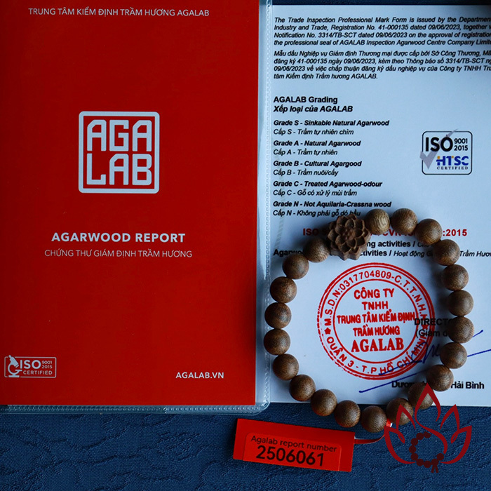 Mỗi vòng tay đều đi kèm mã kiểm định riêng biệt được cấp bởi Trung tâm giám định trầm hương AGALAB – tổ chức uy tín trong ngành, tiêu chuẩn ISO quốc tế.