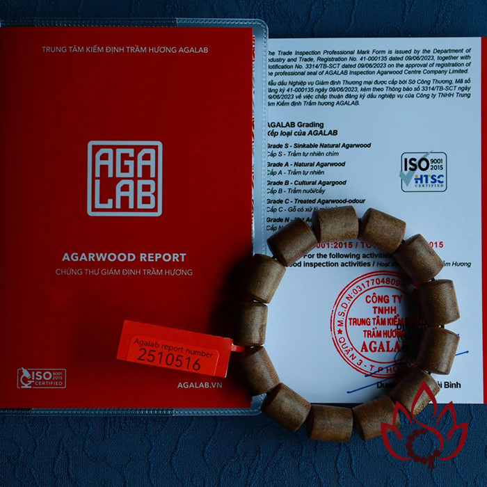 Mỗi vòng tay đều đi kèm mã kiểm định riêng biệt được cấp bởi Trung tâm giám định trầm hương AGALAB – tổ chức uy tín trong ngành, tiêu chuẩn ISO quốc tế.