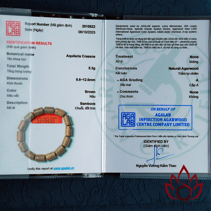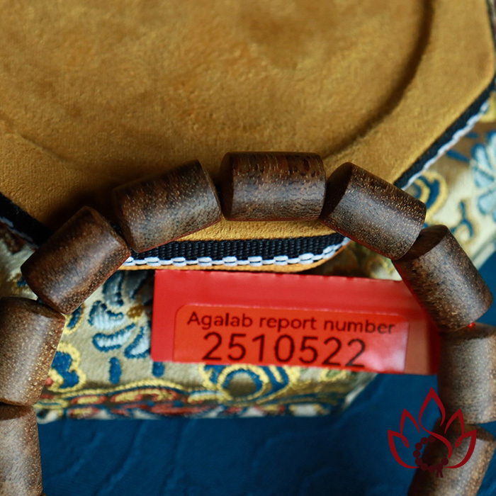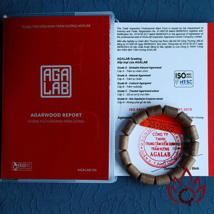 Mỗi vòng tay đều đi kèm mã kiểm định riêng biệt được cấp bởi Trung tâm giám định trầm hương AGALAB – tổ chức uy tín trong ngành, tiêu chuẩn ISO quốc tế.