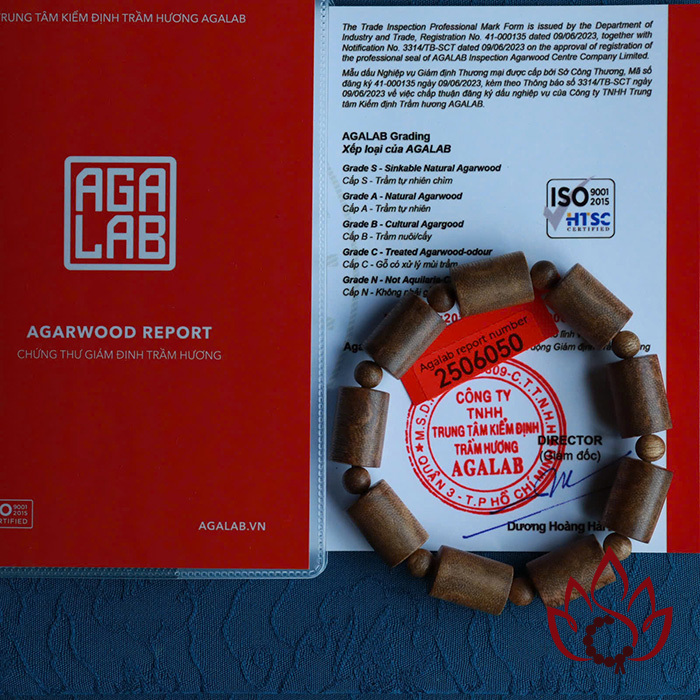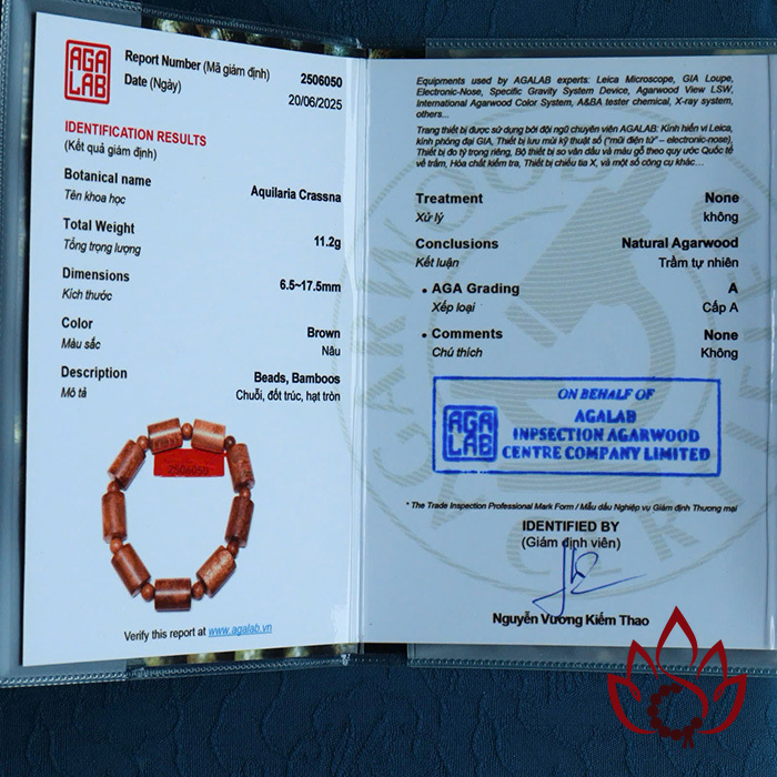 Mỗi vòng tay đều đi kèm mã kiểm định riêng biệt được cấp bởi Trung tâm giám định trầm hương AGALAB – tổ chức uy tín trong ngành, tiêu chuẩn ISO quốc tế.
