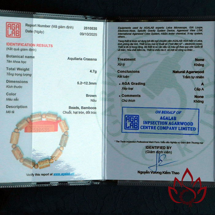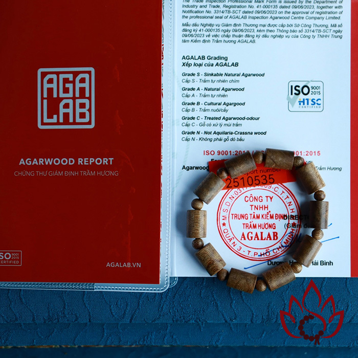 Mỗi vòng tay đều đi kèm mã kiểm định riêng biệt được cấp bởi Trung tâm giám định trầm hương AGALAB – tổ chức uy tín trong ngành, tiêu chuẩn ISO quốc tế.